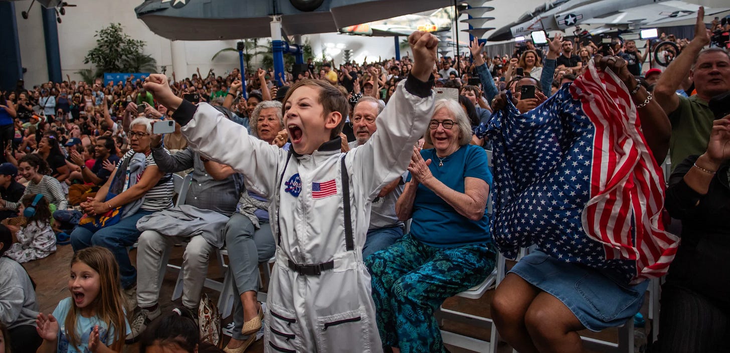 MOON JOY: A young boy wearing an astronaut costume expressed what the rest of us felt at the moment the Orion space capsule carrying the four Artemis II astronauts splashed down in the Pacific Friday night. There was quite a crowd behind him at the San Diego Air and Space Museum. Moon joy, indeed. (Apu Gomes/AFP)